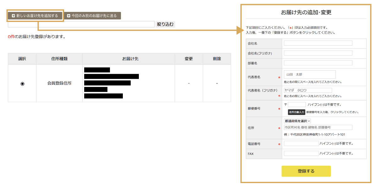 各画面のオレンジ色のボタンから次の手続きに進みます。 お届け先の指定 登録済みのお届け先から今回ご注文の配送先を選択してください。
